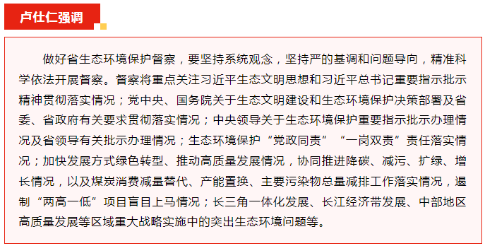 為深入貫徹習(xí)近平生態(tài)文明思想,認(rèn)真落實(shí)黨中央、國(guó)務(wù)院關(guān)于生態(tài)文明建設(shè)和生態(tài)環(huán)境保護(hù)的決策部署,全面貫徹全國(guó)、全省生態(tài)環(huán)境保護(hù)大會(huì)精神,經(jīng)省委、省政府批準(zhǔn),省第一生態(tài)環(huán)境保護(hù)督察組對(duì)池州市開(kāi)展生態(tài)環(huán)境保護(hù)督察。5月30日,督察進(jìn)駐動(dòng)員會(huì)在池州市召開(kāi),督察組組長(zhǎng)盧仕仁、副組長(zhǎng)顧群分別就做好督察工作作了講話,市委書記朱浩東進(jìn)行了進(jìn)駐動(dòng)員,市委副書記、市長(zhǎng)賀東主持會(huì)議。
